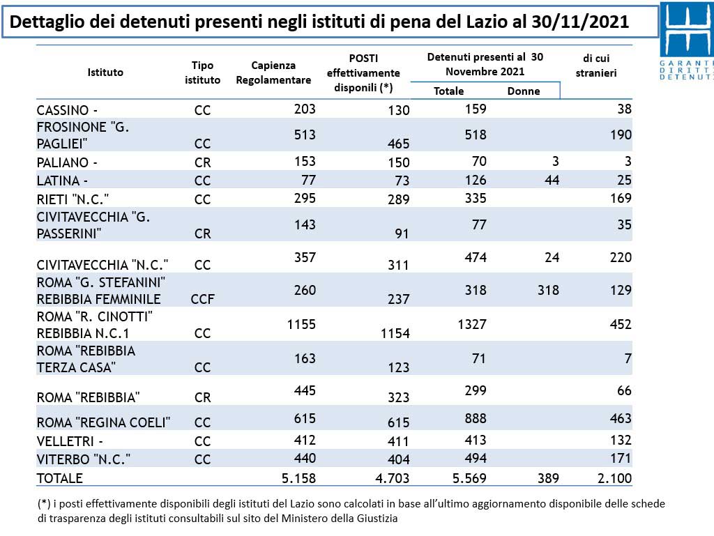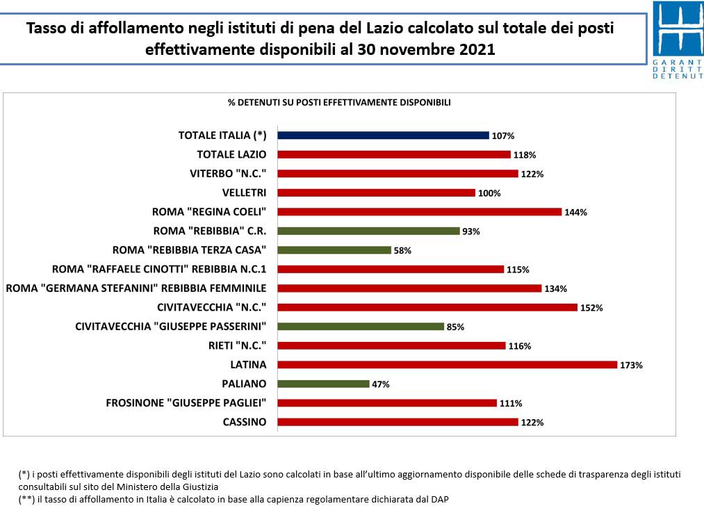 Tassi superiori si registrano a Latina (173%), Civitavecchia (152%), Roma ”Regina Coeli” (144%), e al carcere femminile di Rebibbia ”Germana Stefanini” (134%). Gli istituti di pena meno affollati nel Lazio sono quelli di Paliano (47%), ”Rebibbia Terza Casa” (58%) e Civitavecchia ”Giuseppe Passerini” (85%).