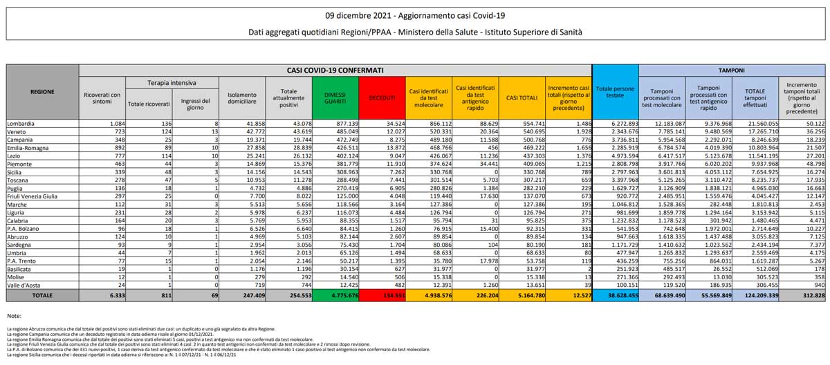 Coronavirus – Il bollettino del ministero della salute del 9 dicembre 2021