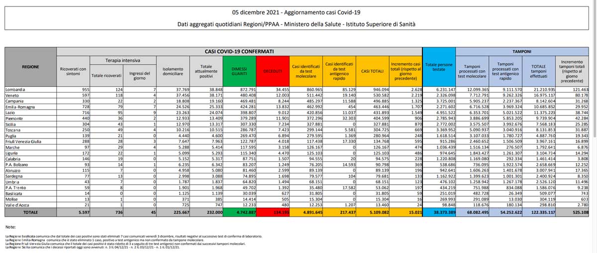 Coronavirus – Il bollettino del ministero della Salute del 5 dicembre 2021