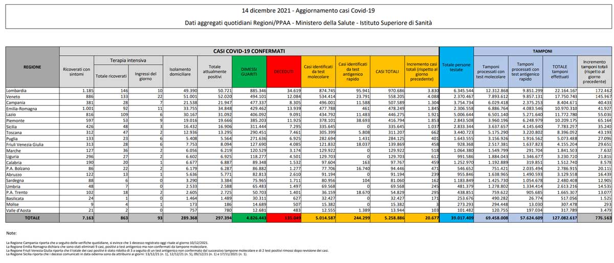 Coronavirus – Il bollettino del ministero della Salute del 14 dicembre 2021
