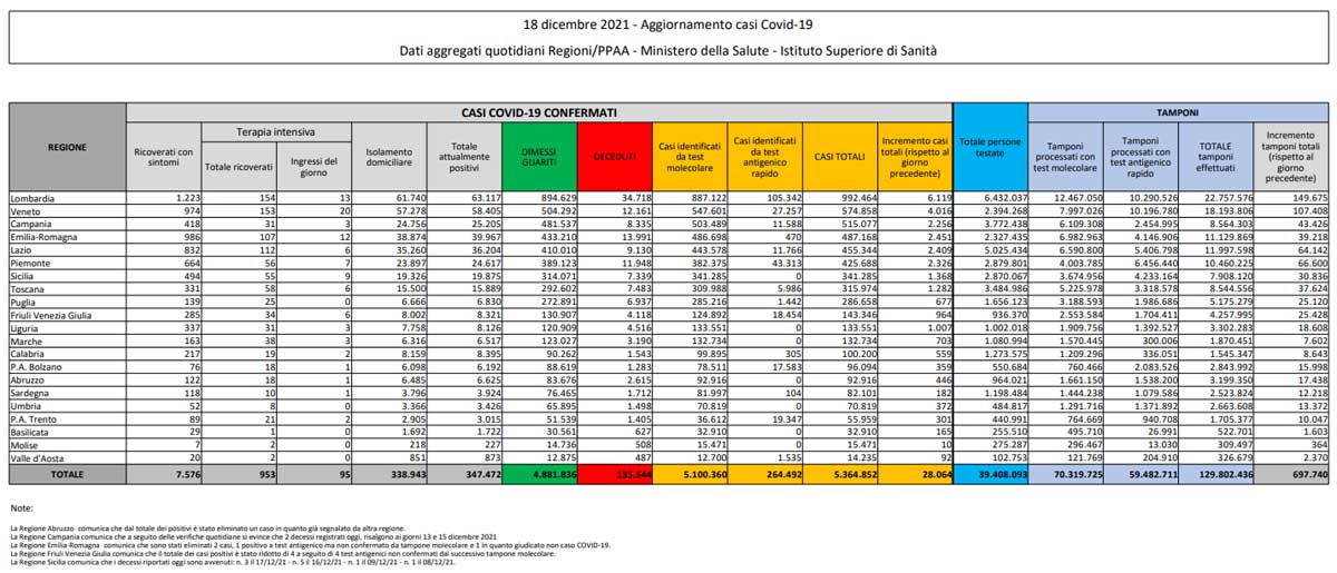 Coronavirus – Il bollettino del ministero della Salute del 18 dicembre 2021 – Clicca per ingrandire