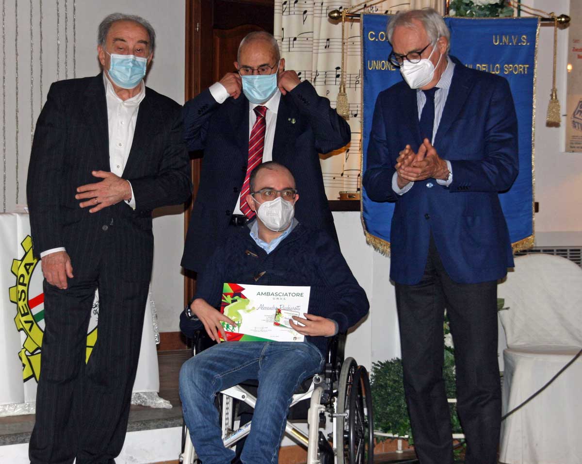 Successivamente il Pp prestigiosa benemerenza di “Ambasciatore della Mission UNVS” ad Alessandro Pacchiarotti, noto atleta viterbese paralimpico che si cimenta in ambito multidisciplinare. La benemerenza è stata assegnata dal consiglio nazionale dell’UNVS con la seguente motivazione: Condivide attraverso i suoi primati, l’impegno agonistico e l’esempio sportivo i valori dell’Unione Nazionale Veterani dello Sport.