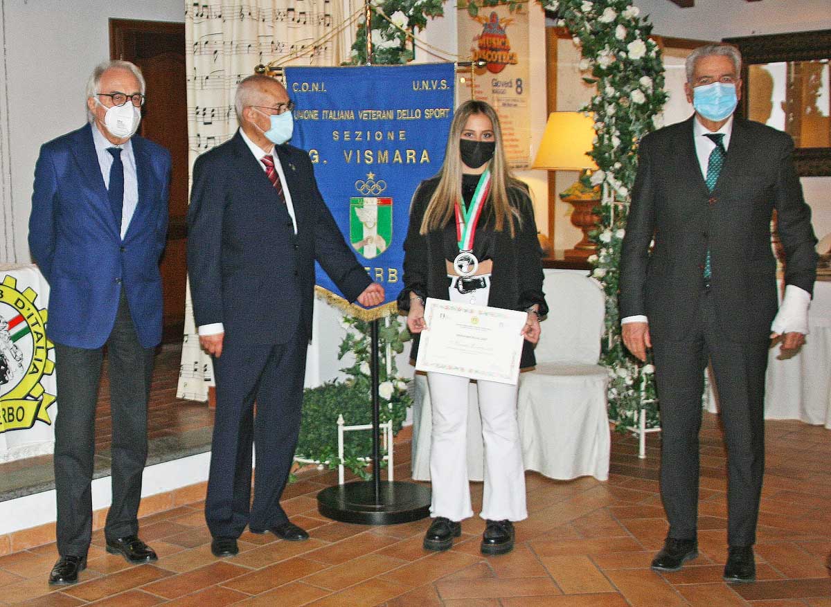 Il sindaco di Viterbo Giovanni Maria Arena, che non è voluto mancare all’appuntamento, ha consegnato all’Atleta dell’Anno 2021 il prestigioso medaglione messo a disposizione dal consiglio nazionale UNVS raffigurante l’atleta Oliblì nel momento dell’incoronazione dopo la vittoria.