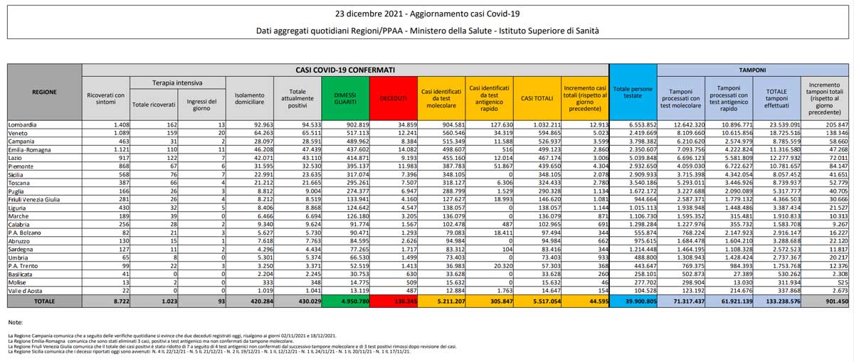 Coronavirus – Il bollettino del ministero della Salute del 23 dicembre 2021