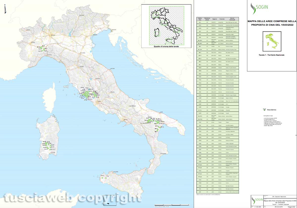 Viterbo - Deposito nucleare, confermati tutti i siti della Tuscia tra Maremma e monti Cimini. Sarebbe questa la nuova carta Sogin dei siti idonei ad ospitare il deposito di scorie nucleari e rifiuti radioattivi.Documenti: Gli atti conclusivi del seminario nazionale – Le aree della Tuscia idonee alla costruzione del deposito nazionale di rifiuti radioattivi e nucleari – Quattordici comuni e oltre 7 mila ettari coinvolti, le aree della Tuscia idonee per il deposito nazionale