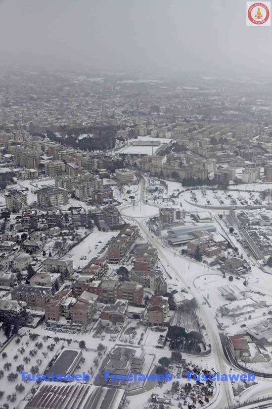 “I militari – si legge in una nota dei Vigili del fuoco – , che ringraziamo per disponibilità e professionalità, ci hanno permesso di sorvolare Viterbo e la parte sud della Provincia, per valutare dall’alto la situazione neve e renderci conto di come sta evolvendo l’emergenza in atto”. I Vigili del fuoco di Viterbo hanno effettuato oltre 250 interventi in tutta la Provincia. Grazie al raddoppio dei turni di servizio, sono state create 8 squadre (per un totale di 50 uomini) che lavorano H24 su tutto il territorio. Le tipologie di intervento maggiormente richieste sono state: soccorso a persone, rimozione rami ed alberi pericolanti, recupero automezzi bloccati nella neve, trasporto di persone bloccate dal maltempo, verifiche a seguito dei continui black-out, verifiche cornicioni e tetti, etc..